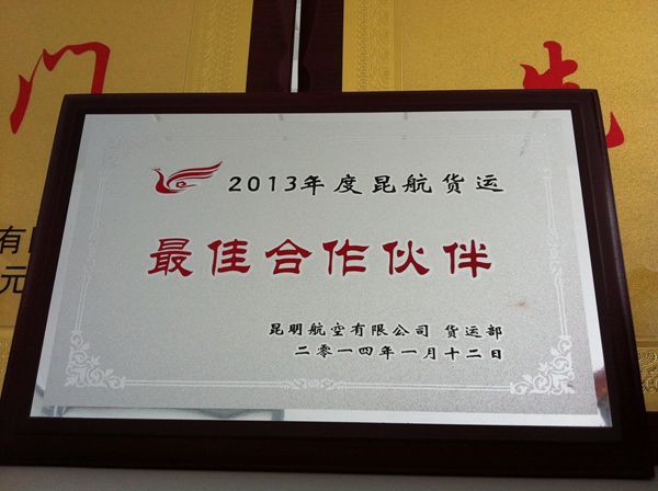 继物流公司获得东航江苏有限公司的“卓越合作伙伴”荣誉称号后,再次获得昆明航空有限公司授予的2013年度“最佳合作伙伴”称号。