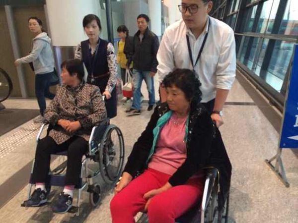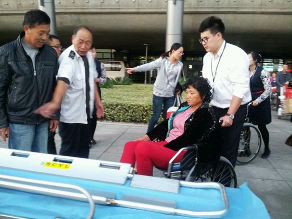 在航班落地前地服部工作人员及时主动与运控取得联系,通过运控与机组的沟通,获知旅客具体情况。航班落地前,地服部在登机口加派人手,待飞机到站后,工作人员上机与机组交接。此次两位旅客同为老人,均为旅行过程中受伤,一位大腿骨折,一位脚踝严重扭伤肿胀。考虑到客人情况,工作人员将轮椅搬上飞机,帮助两位伤病旅客顺利下机,坐上救护车。