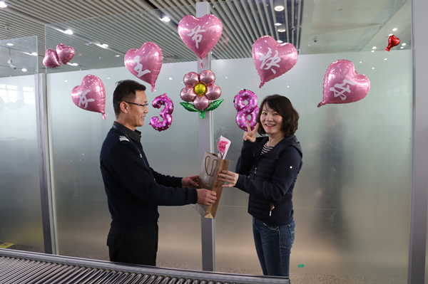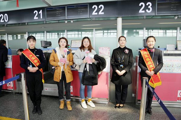 丹玉班组全体组员秉承真情服务理念,在这特殊的日子里为进出港旅客提供一站式、一体化和全流程的地面服务。巡视和问询人员身披绶带,以焕然一新的形象向旅客提供服务,在接待现场和接听旅客电话时,只要是女士,都会首先送上“祝您节日快乐”的节日祝福。在值机柜台开设女性专属柜台方便女性旅客值机体验,11点18分现场办理值机手续的幸运女性旅客额外获得免费使用头等舱休息室的福利。安检通道设立“爱心”通道为女性旅客过检专用,并进行了精心布置,为出行的女性旅客提供优质快捷的安检服务。6位美丽的安检员们用热情的服务为过检女性旅客送上节日的专属问候。11点18分过检的女性旅客获得现场“幸运女神”,丹玉班组为她送上精美的丝绸礼品,祝福女性朋友们节日快乐!