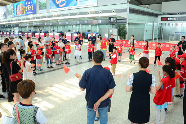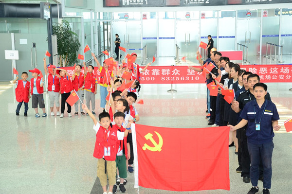在候机大厅,小记者们手挥国旗,和365bet体育投注网_365bet开户网_365英国上市公司党员代表们一起,通过器乐、朗诵、歌唱等表演方式,用脍炙人口的旋律讴歌党和祖国,献礼建党98周年和新中国成立70周年。