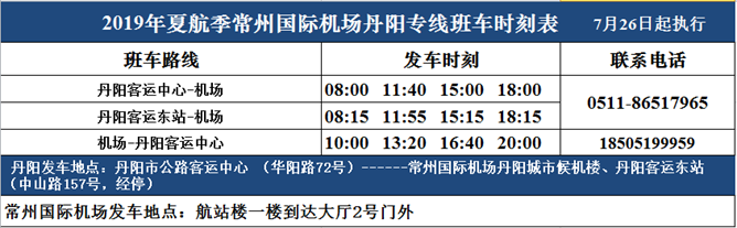 常州国际365bet体育投注网_365bet开户网_365英国上市公司至丹阳往返365bet体育投注网_365bet开户网_365英国上市公司专线班车于2014年1月开通至今,运行情况相对稳定。丹阳地区紧邻常州365bet体育投注网_365bet开户网_365英国上市公司,地理优势明显,随着常州国际365bet体育投注网_365bet开户网_365英国上市公司航班量的不断增加,当地旅客从常州365bet体育投注网_365bet开户网_365英国上市公司出行的需求也日益增加,为更好地为丹阳地区旅客提供便捷的地面交通服务,自2019年7月26日起,丹阳至常州365bet体育投注网_365bet开户网_365英国上市公司专线班线加密至每天四班,具体班车时刻如下:
