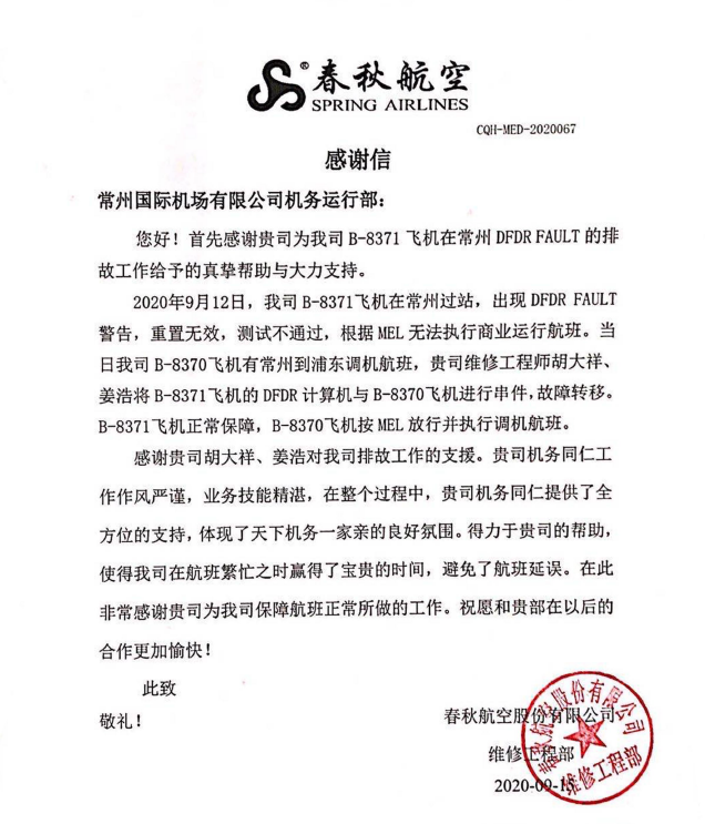 2020年9月12日,由沈阳飞来常州的9C6173航班落地后,机组反映ECAM显示DFDR故障,常州365bet体育投注网_365bet开户网_365英国上市公司迅速处置,在确保飞机性能完好的前提下,护航准点起飞,获得了春秋航空公司的高度称赞。