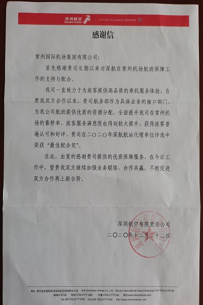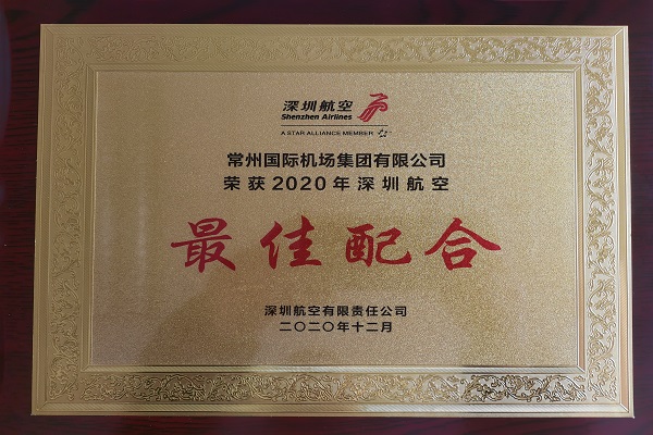 近日,常州国际365bet体育投注网_365bet开户网_365英国上市公司在2020年深航全国航站代理单位评选中荣获“最佳配合”奖。