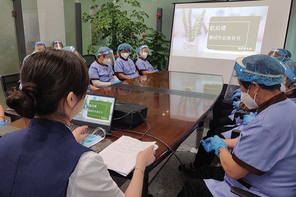 8月26日、27日,地面服务部综合业务室分两批对高正物业航站楼全体保洁开展了《航站楼擦拭作业指导书》学习培训。