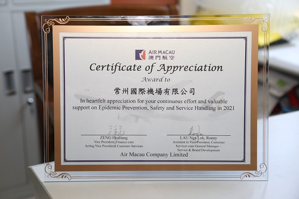 近日,澳门航空授予常州365bet体育投注网_365bet开户网_365英国上市公司奖牌,对2021年度常州365bet体育投注网_365bet开户网_365英国上市公司在疫情防控、安全和地面服务中给予澳门航空的持续贡献表达了由衷的感谢。